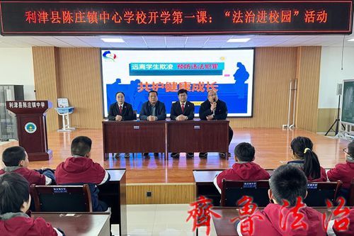 利津法院陈庄法庭副庭长刘振华和法官助理张玲走进陈庄镇中学,以“远离学生欺凌 预防违法犯罪 共护健康成长”为主题