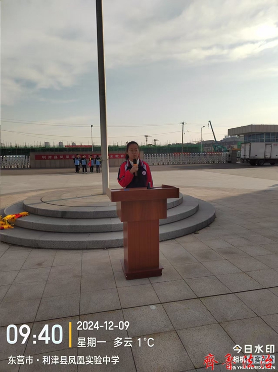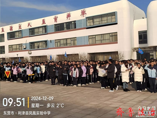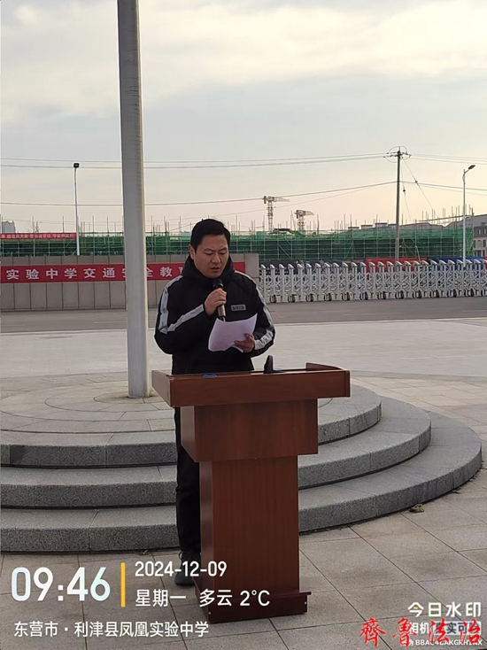齐鲁法治(东营)陈国兰 为切实做好冬季道路交通安全教育,进一步加强校园交通安全宣传,提升学生交通安全意识和自我保护的能力,2024年12月9日,东营市利津县凤凰实验中学利用升旗仪式时间在和美广场组织召开了交通安全教育大会,利津县凤凰实验中学党总支书记岳长收、校长付强、副校长郭立波、安保主任李瑞、艺体组主任薄其军以及2000多名师生共同参加了大会。