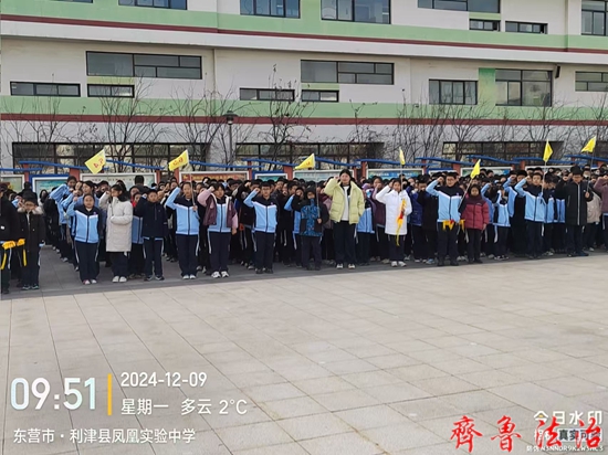 东营市利津县凤凰实验中学利用升旗仪式时间在和美广场组织召开了交通安全教育大会。