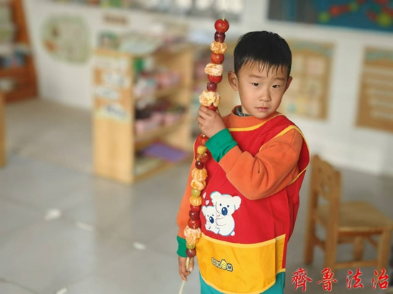 山东淄博高青县木李学区中心幼儿园:幼童巧制冰糖葫芦