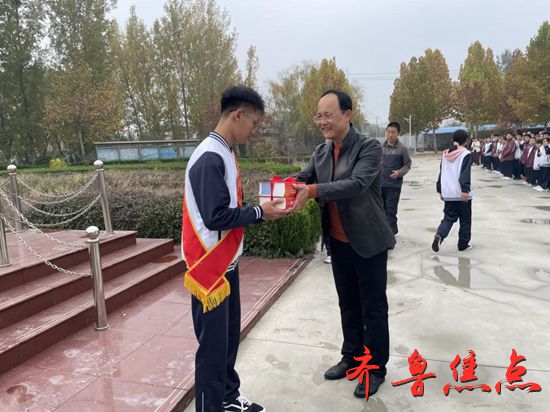初四级部主任李佃康主持颁奖仪式,班主任潘科蓓、起凤中心学校副校长王哲、起凤镇人民政府人大主席车成坤为侯明泽同学颁奖。