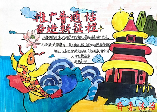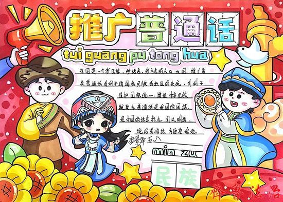 在老师的带领下,同学们手举宣传牌,分别在校园门口和周边社区开展民族团结和推广普通话宣传。同学们还绘制了推普主题的手抄报进行宣传。