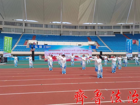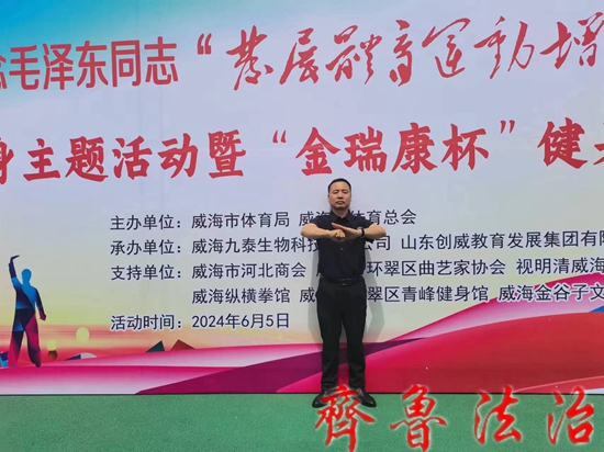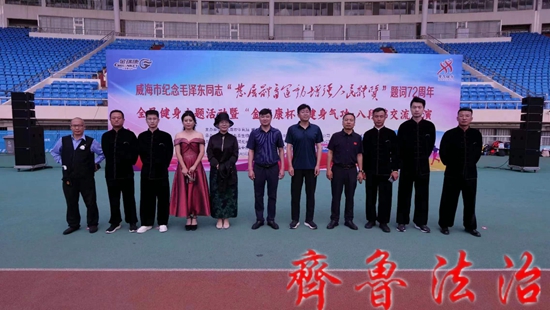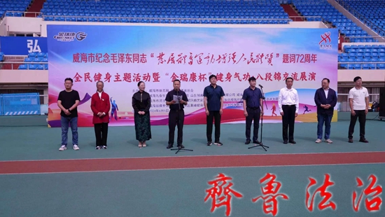 齐鲁法治(威海讯)龙艳妮 威海市“纪念毛泽东同志发展体育运动增强人民体质题词72周年”全民健身主题活动暨威海市金瑞康杯健身气功八段锦交流展演6.5在威海体育场隆重举行,本次活动由威海市体育局威海市体育总会农工党威海市委会主办,威海九泰生物科技有限公司,山东创威教育发展集团有限公司农工威海市金瑞康艺术团农工党高区支部威海武术研究院创威国际武院承办。