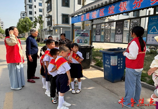 山东淄博高青县木李学区中心幼儿园的师生化身志愿者走进社区,向小区里的居民进行垃圾分类知识宣传。