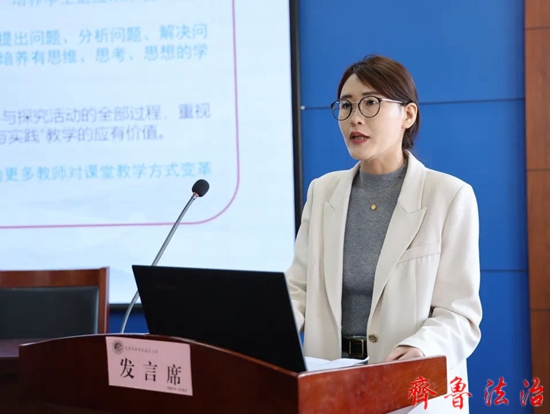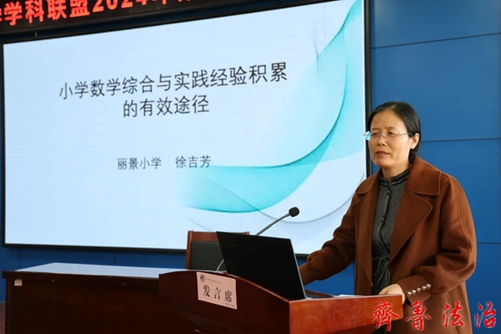 东营市实验小学卢芬老师做经验交流《新课程理念下小学数学中高年级“综合与实践”教学思考》,针对中高年级“综合与实践”领域做出内容分析与教学实践。卢老师强调让学生在真实情境中产生思索、激发思维、发展素养。老师要理清角色、关注学生、及时指导,既有理论又重实践。