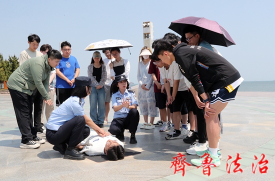 齐鲁法治(烟台讯)马丹鸣 6月16日,针对海边游客日益增多的实际,烟台市公安局莱山分局清泉寨海岸派出所联合海警局莱山工作站、东顺旅游公司向海边游客和烟台大学的同学们开展一次防溺水安全宣传。