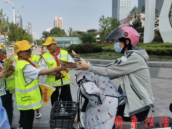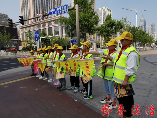 在芝罘区南大街的十字路口,同学们深度体验交通警察的日常工作。执勤交警现场讲解交通安全知识和出行常识,传授劝导交通违法的方式技巧,同学们现场体验维护交通秩序,在非机动车道阻止想要闯红灯的行人和自行车,并向过往市民发放“文明出行倡议书”,引导群众文明交通,平安出行。
