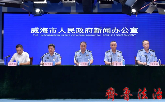 齐鲁法治(威海讯)马丹鸣 8月22日下午,威海市新闻办举行新闻发布会,威海市公安局党委委员、副局长苏卫军,市公安局交警支队支队长李涛,刑侦支队支队长杨玉平,治安支队支队长王兆振,通报全市公安机关夏季治安打击整治“百日行动”开展情况,并回答记者提问。