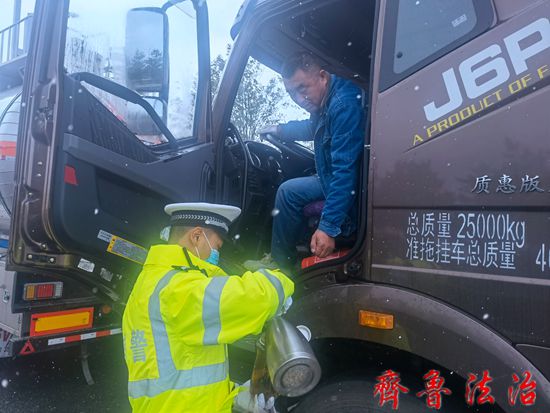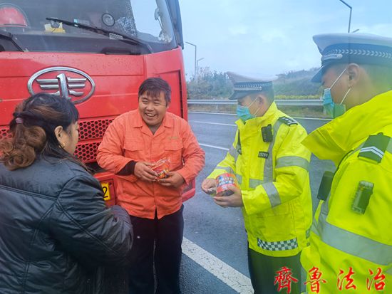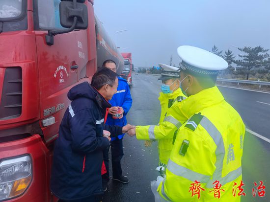 为了帮助滞留货车司机,烟台市高速公路蓬莱大队民警赶往高速入口疏导交通,同时为滞留车辆驾驶员送去了方便面、热水,让大家在冬日里感受到温暖。
