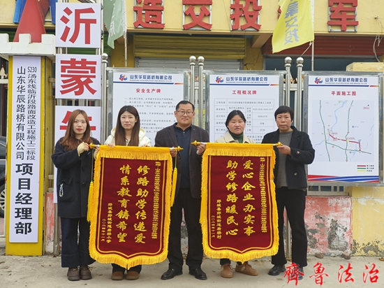 齐鲁法治(临沂)陈国兰 近日,临沂市郯城街道唐桥村带领郯城街道唐桥小学教师及家长代表将印有“修路助学传递爱 情系教育铸希望”的锦旗送到山东华辰路桥有限公司S230汤东线临沂段路面改造工程施工二标段项目经理部负责人手中,对他们捐资修路助学的善举表示感谢。