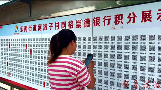 沿着两侧种满了月季花的“繁花大道”进入村内,就能听到大喇叭传出的声音,“本次人居环境整治过程中,设环境卫生示范街、达标街、美丽庭院户三个奖项,示范街所在每户每月加信用分2分,免交全年卫生费,加挂示范街牌匾,同等条件下优先改善本条街基础设施,如安装路灯等……”村委广场旁的宣传栏上张贴着一面上百个二维码的“信用积分榜”,一位村民正在用手机扫描上面的二维码。“我今年积分到现在还有55分,再攒一攒能兑出一个保温杯。”信用分成了窝洛子村内部的“硬通货”,村里的人都知道——“做好事就能换好东西”。