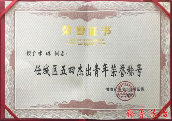 近日,共青团济宁市任城区委发布《关于表扬任城区五四杰出青年的通报》,山东省济宁市任城区检察院员额检察官李琳被授予“任城区五四杰出青年”荣誉称号。