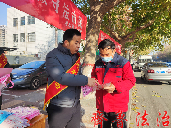 青年司法所联合青年路街道综治办、临清市法学会青年工作站,在青年路街道办事处设置宣传台,悬挂宣传标语,向辖区群众发放宪法彩页和法治围裙,并现场讲解宪法部分条款,解答群众法律咨询。