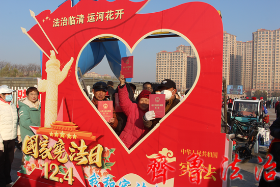 活动现场,“法治临清 运河花开 我和宪法合个影”吸引广大市民朋友们纷纷拍照留念,大屏幕循环播放的宪法宣传公益广告和“我和宪法”微视频吸引游人纷纷驻足观看。