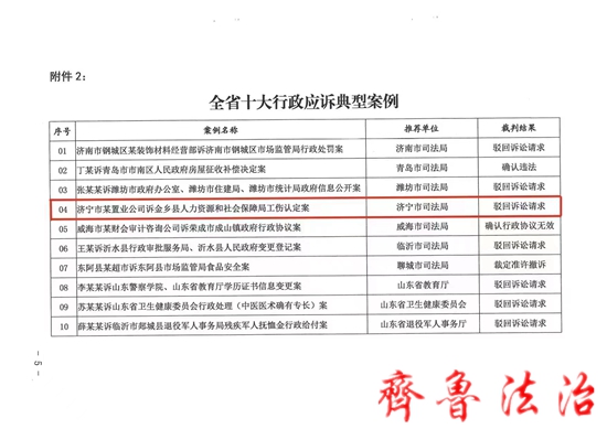 山东省人民政府行政复议委员会办公室公布全省首届十佳行政复议优秀法律文书和十大行政应诉典型案例,济宁金乡县司法局提报的行政应诉案例“济宁市某置业公司诉金乡县人力资源和社会保
