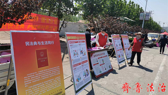 圈里大集活动现场,通过设立知识展板、悬挂条幅、发放宣传材料、案例分析以及现场解答法律咨询等方式,向群众讲解《民法典》知识,让群众充分了解到《民法典》不仅仅是一部法律,更与日常生活中财产安全、生命健康、人格尊严、婚姻家庭息息相关。活动现场还宣传了《法律援助法》、《临沂市法治乡村条例》、扫黑除恶和反邪教防诈骗等与群众生产生活密切相关的法律法规知识。