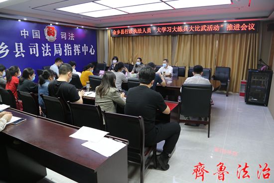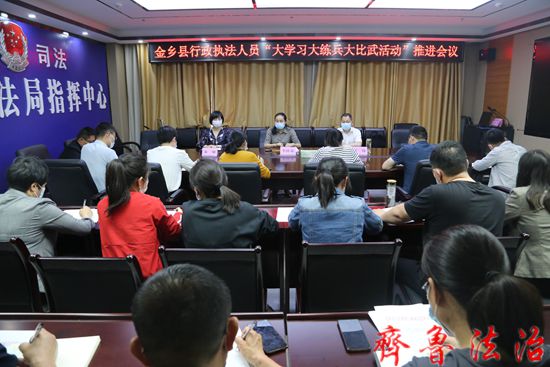 齐鲁法治(济宁讯)于清林 5月16日下午,山东济宁金乡县行政执法人员“大学习大练兵大比武活动”推进会议在县司法局四楼会议室召开,县司法局党组成员、副局长李桂花同志主持会议并讲话,县直各执法部门法规科科长、县司法局行政执法监督科全体人员参加了会议。