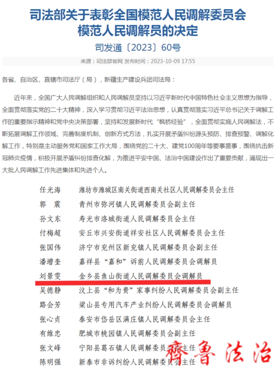 齐鲁法治(济宁讯)于清林 10月8日,最高人民法院、司法部在北京联合召开全国调解工作会议,会上公布了全国模范人民调解委员会和全国模范人民调解员名单。济宁金乡县鱼山街道人民调解委员会调解员刘景雯被表彰为“全国模范人民调员”!