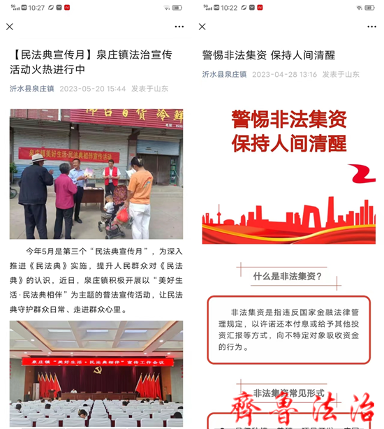二、“普法+网络课堂”套餐,让普法宣传有实有效。充分利用泉庄镇微信公众号、快手、抖音和微视频等方式制作发布法律法规图解、专家解读等信息100余条。在微信公众号开设“八五普法”宣传专栏,推出20余期普法专题新媒体产品。作品选题紧贴群众需求,根据节点选取“森林防火人人有责”“民法典宣传月”“国家安全教育”等主题,突破以往官方普法严肃、刻板形象,将普法工作娱乐化、亲民化。以轻松有趣的动画短视频和情景剧演绎,制作发布原创快板、顺口溜短视频等群众喜闻乐见的宣传方式,结合律师、普法志愿者的口语化解析,及时为广大群众普及法律知识,将宣传触角有效地延伸到每一户家庭,提高群众防范不法侵害、维护合法权益的意识。