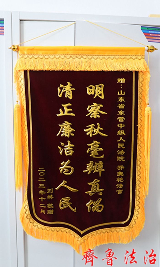 近日,东营中院民三庭收到了一份特殊的快件,一面来自当事人刘某的锦旗,锦旗上“明察秋毫辨真伪 清正廉洁为人民”是刘某对东营中院民三庭审判工作的肯定与感谢。
