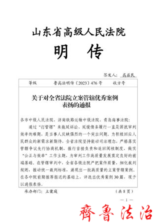 齐鲁法治(东营讯)李春军 近日,省法院下发《关于对全省法院立案管辖优秀案例表扬的通报》,东营广饶法院高德亮法官承办的(2021)鲁0523民初314号民间借贷纠纷管辖案被省法院评为立案管辖优秀案例。