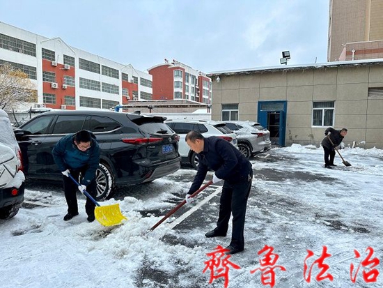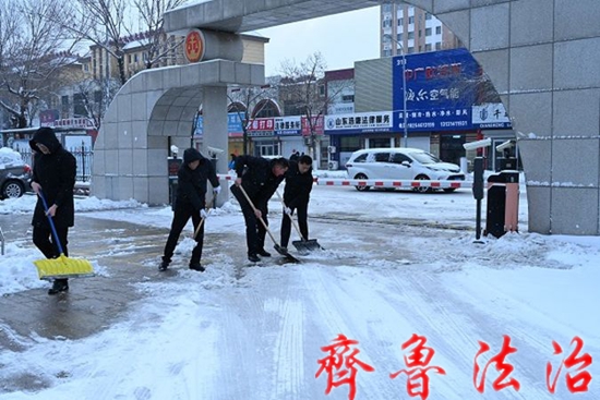 齐鲁法治(东营讯)李春军 随着较强冷空气的来袭,我市迎来入冬以来第一场大范围降雪。为确保道路畅通,保障干警和群众出行安全,12月15日上午,东营垦利区法院及时开展破冰除雪行动,全面、彻底对法院内部及“门前三包”责任范围进行冰雪清理,用实际行动破冰除雪开出“便民路”。