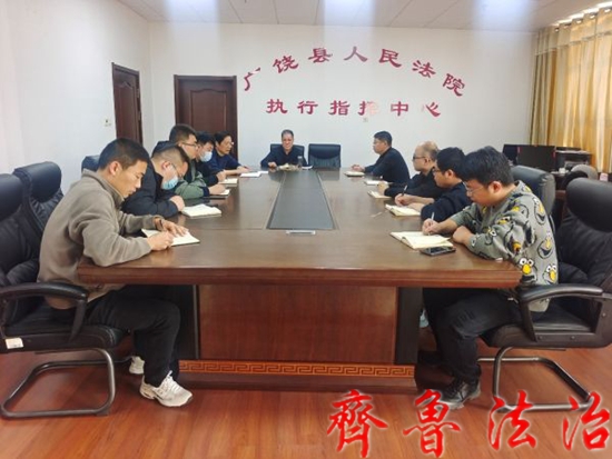 广饶法院执行局利用周末时间召开执行干警座谈会。会议由党组副书记、副院长王中永主持,执行局局长张东亮及执行局在编干警参加座谈会。