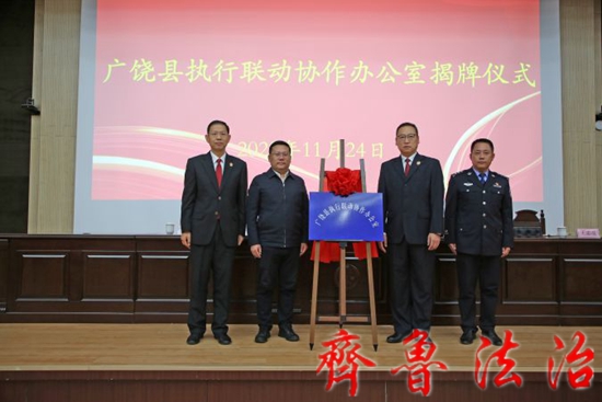 11月24日,东营广饶县执行联动协作办公室揭牌仪式在广饶法院举行。县委常委、政法委书记王茗出席仪式并讲话
