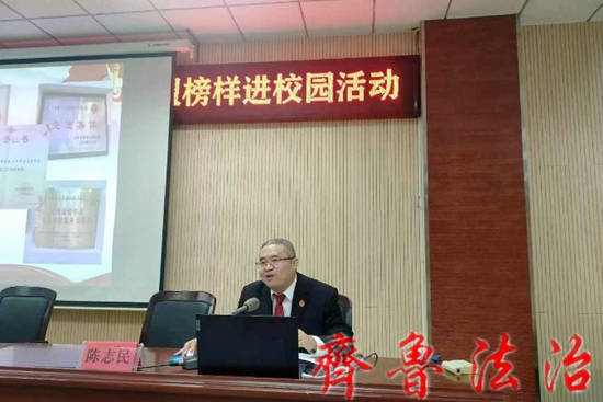 齐鲁法治(东营讯)李春军 11月1日下午,根据全县“青春的偶像”主题思政课活动安排,东营利津法院执行局局长、陈庄法庭负责人陈志民受邀到利津县基础教育联盟合作交流部,开展了题为《守初心,司法为民促和谐 担使命,扎根基层献芳华》的专题报告,以“青春的偶像”身份,为全校师生上了一堂生动的思想政治课。