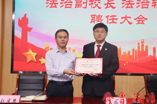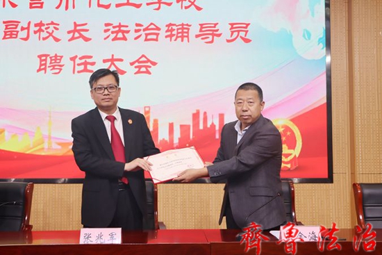 齐鲁法治(东营讯)李春军 10月11日,东营利津法院党组副书记盖盛永被东营市化工学校聘为法治副校长,刑庭庭长张兆军受聘法治辅导员。