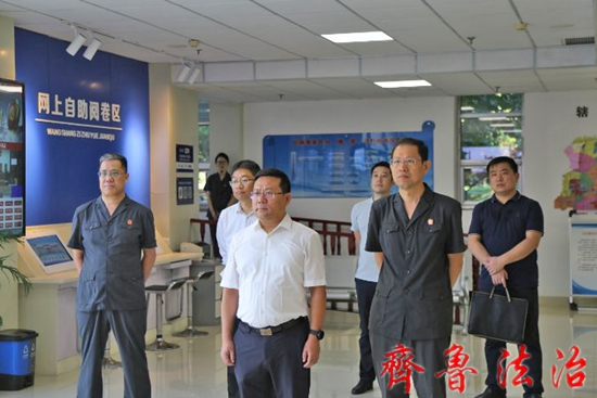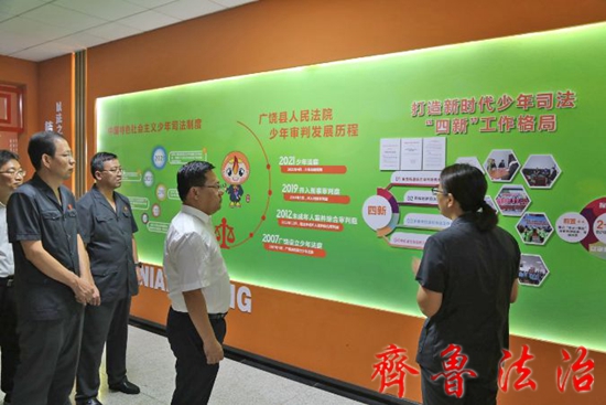 调研组一行实地参观了广饶法院“桔灯”少审品牌展厅、家庭教育指导服务站、人民调解室、诉讼服务中心、党员活动室、院史馆等场所。