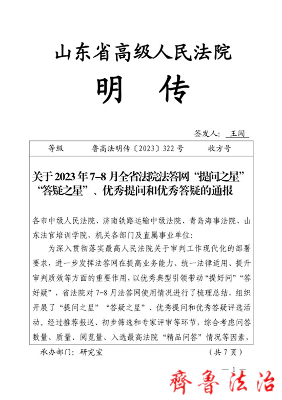 近日,省法院对7-8月法答网使用情况进行梳理总结,组织开展法答网“提问之星”“答疑之星”、优秀提问和优秀答疑评选活动
