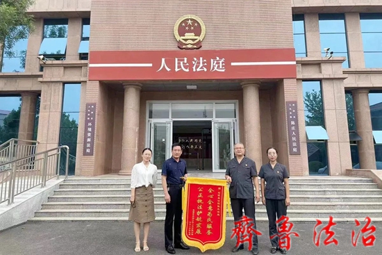 东营市某市政工程有限公司将一面印有“全心全意为民服务 公正执法护航发展”的锦旗送到东营利津法院陈庄法庭陈志民法官手中,以表达对陈法官公正执法、以司法力量助力企业平稳发展的