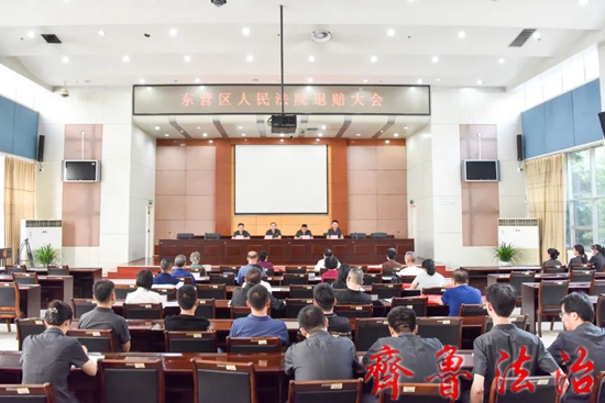 9月8日上午,东营市东营区人民法院召开关于被执行人薛某、赵某等十五人责令退赔、罚金执行一案退赔大会。因涉及的被害人遍及全国多个省份,会议采用“线上+线下”方式举行,部分被害人代表参加了此次会议。会议邀请了区融媒体中心参加。东营区人民法院党组副书记、副院长李乃煊同志出席会议并作总结讲话。东营区人民法院党组成员、执行局长纪鹏辉主持退赔大会。