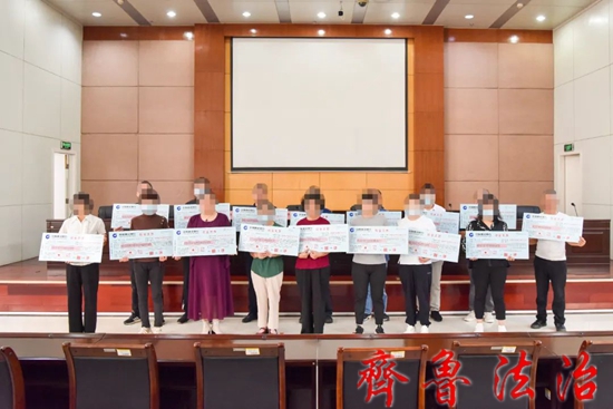 会议中,东营区人民法院执行局案件承办法官辛浩通报了基本案情及退赔款追缴情况,东营区人民法院执行局第二执行团队负责人王锋宣读了退赔方案。然后根据退赔方案,分别向各受害人依次发放退赔款支票。