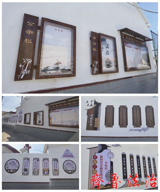 新宣传阵地由“乡村文明实践站”、“村规民约”、“和美乡村”、“宣传公示栏”四部分组成。“乡村文明实践站”通过言简意赅的语言以文化人、成风化俗,向村民传播大杜本土文明;“村规民约”向村民详细介绍了修订后的大杜村《村规民约》具体内容,以增强村民法治意识、提升村庄治理效果;“和美乡村”通过图案、标语形式向村民宣传了“百善孝为先、以德行天下”为核心的的中华民族传统美德;“宣传公示栏”包含“公示栏”“法治栏”“三务公开栏”三部分,分别用于村“两委”重大事务公开、乡村惠民普法、“三务”日常公示等。
