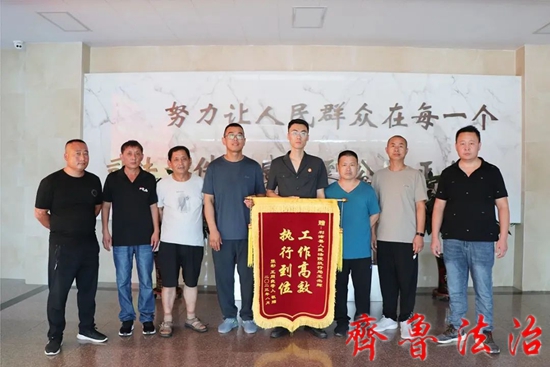 齐鲁法治(东营讯)李春军 8月7日,一起劳动争议涉民生案件申请执行人将一面书有“工作高效 执行到位”的锦旗送到东营利津法院执行局干警王杰辉手中,表达对法院高效办案的感激之情。