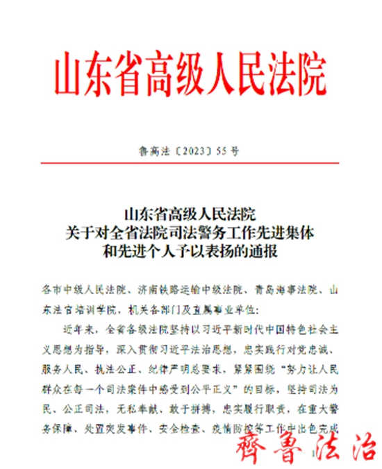 齐鲁法治(东营讯)李春军 近日,山东省高级人民法院对全省法院司法警务工作先进集体和个人予以通报表扬,东营广饶法院司法警察大队马文芝同志被评为全省法院司法警务工作先进个人。