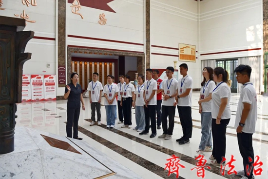 7月24日上午,同学们在东营区法院西门集合完毕并领取学员证,少审法官张婷首先带领学员们参观了法治教育基地和大审判庭,了解法治发展历程和法院活动。