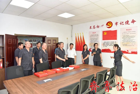 观摩组一行实地查看了辛店法庭党建活动室、诉讼大厅、人民调解室、家庭教育指导工作室、申国锋法官工作室、调解室,法治文化角、法警值班室等场所,重点听取了辛店法庭关于“创建新时代枫桥式人民法庭,争当马锡五式好法官”观摩会落实情况、“四室两中心”建设情况、人民法庭“法润新枫”品牌创建情况及“小案事不小、小案不小办”专项活动中的特色亮点和审判经验,并与法庭工作人员进行深入交流,详细了解法庭在司法服务、诉前调解、自身建设、队伍管理、法庭安全等各项工作开展情况并提出指导意见。