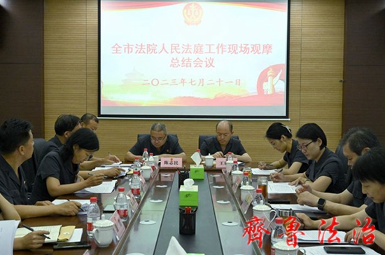 齐鲁法治(东营讯)李春军 为深入贯彻习近平法治思想,检验“创建新时代枫桥式人民法庭、争当马锡五式好法官”现场观摩会贯彻落实情况,研究规划推动人民法庭工作高质量发展工作举措,进一步推动全市人民法庭工作高质量发展,7月20日-21日,东营中院召开全市法院人民法庭第二次现场观摩会,对全市法院6个人民法庭进行集中现场观摩,并继续围绕“创建新时代枫桥式人民法庭、争当马锡五式好法官”主题进行交流研讨。会上,各人民法庭作了经验交流,与会人员根据观摩情况对各人民法庭进行了评分。
