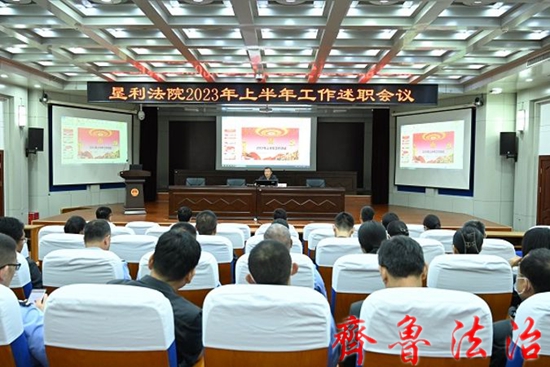 齐鲁法治(东营讯)李春军 为全面总结上半年工作开展情况,认真查摆问题,明确下半年工作思路,7月21日上午,东营垦利区法院召开2023年上半年工作述职会议。会议由党组成员、副院长杜海军主持,院领导班子成员及全体干警参加会议。