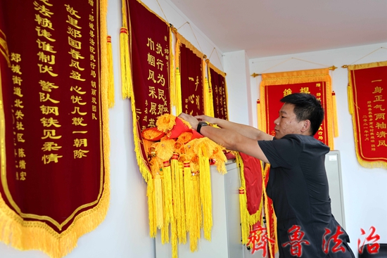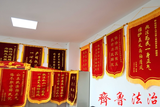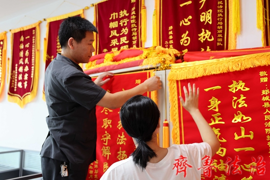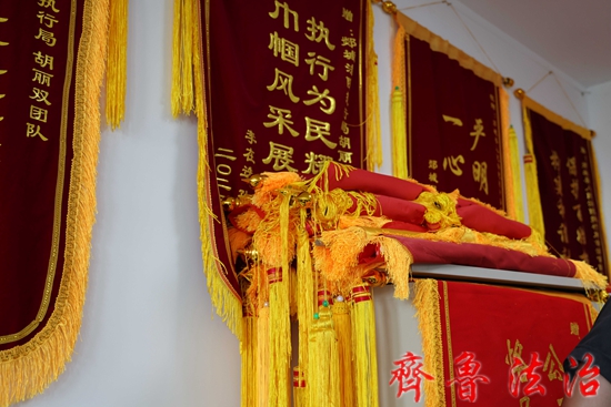 这种群众自发给执行法官送锦旗的场面,在郯城法院几乎每周都会发生。在郯城法院执行指挥中心数十平方米的两面墙壁上挂满了各式各样的锦旗,这些锦旗有的是申请人送的,有的是被执行人送的,还有的是案外人送的。整个墙壁红底金字,流苏飘飘,映得满堂生辉,形成了一道壮观的风景。由于锦旗太多墙上实在挂不下,干警们只好把后来收到的锦旗登记造册,卷成筒状,整齐地码放在橱柜上方,像一捆一捆的锦缎,又像古色古香的画轴,格外引人注目。