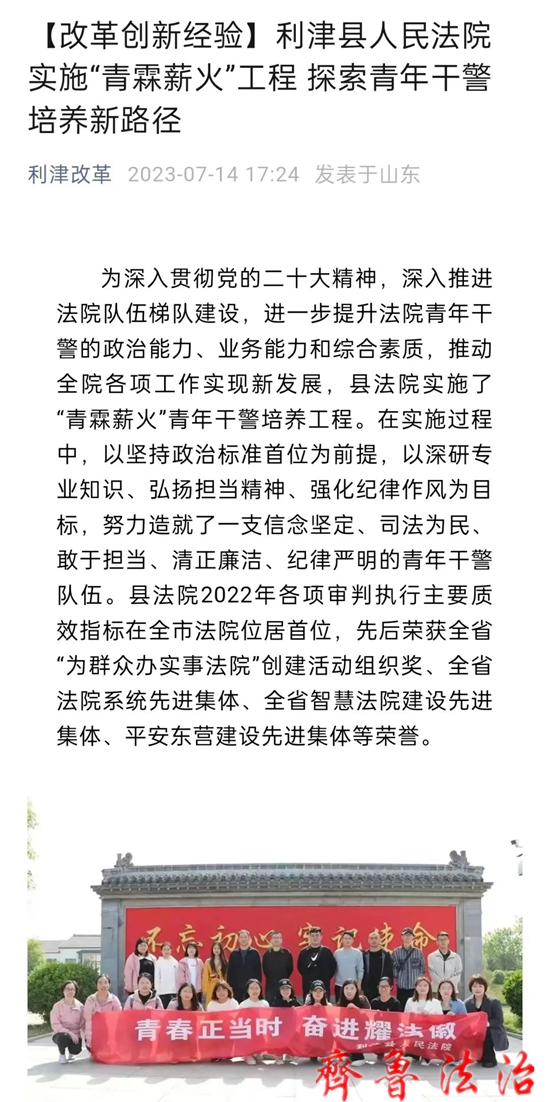 齐鲁法治(东营讯)李春军 为深入贯彻党的二十大精神,深入推进法院队伍梯队建设,进一步提升法院青年干警的政治能力、业务能力和综合素质,推动全院各项工作实现新发展,东营利津县法院实施了“青霖薪火”青年干警培养工程。在实施过程中,以坚持政治标准首位为前提,以深研专业知识、弘扬担当精神、强化纪律作风为目标,努力造就了一支信念坚定、司法为民、敢于担当、清正廉洁、纪律严明的青年干警队伍。县法院2022年各项审判执行主要质效指标在全市法院位居首位,先后荣获全国“人民法院党建工作先进集体”、全省“为群众办实事法院”创建活动组织奖、全省法院系统先进集体、全省智慧法院建设先进集体、平安东营建设先进集体等荣誉。
