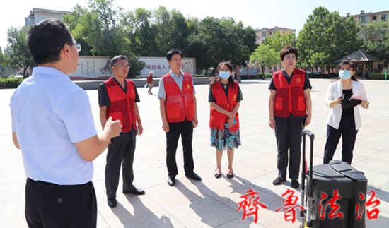 齐鲁法治(东营讯)李春军 7月7日,由东营市法院承办,与市委宣传部共同组织,市妇联、市机关事务局、市油地校融合办、市税务局、东营银行等单位在府前社区怡邻广场共同开展了“夏日送清凉 普法进社区”组团式志愿服务活动。市委宣传部副部长李炎,市法院党组成员、政治部主任张明磊及各单位分管领导、志愿者共计60余人参加活动。