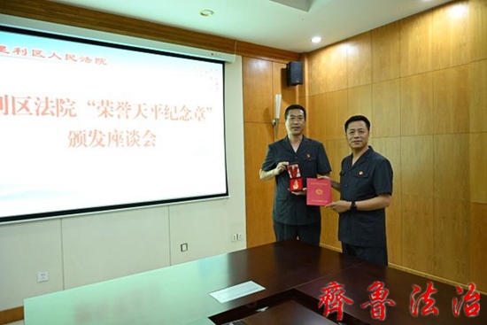 6月30日上午,东营垦利区法院党组书记、院长张志刚为从事法院工作满30年的杜海军、王方顺、宋保卫、马振刚、王俊杰、魏广松6名同志颁发“荣誉天平纪念章”。