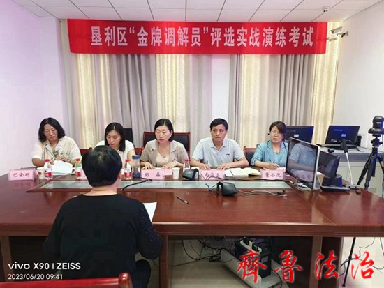6月20日上午,东营垦利区“金牌调解员”评选活动在垦利区司法局进行,立案庭法官尚学三应邀参加并担任实战演练评委。