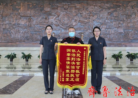 齐鲁法治(东营讯)李春军 “真没想到开完庭仅一天就审结了,这个案子从仲裁到一审花了一年多,你们老说只是做了分内工作,但你们真得是为我们老百姓考虑,谢谢你们!”近日,一起劳动争议案件当事人尹某为东营中院民一庭送来一面“人民司法可敬可颂,依法判决治邪扶正,洞察案情驱散迷雾”的锦旗,对法院工作表示感谢,对法官司法为民、公正高效办案工作作风给予了充分肯定和认可。