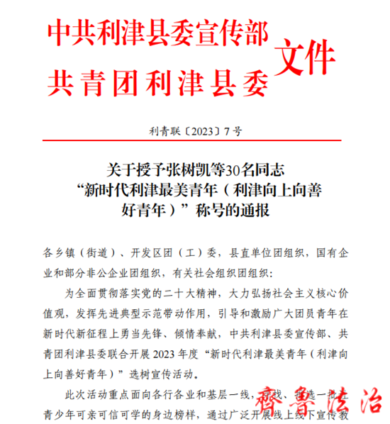 齐鲁法治(东营讯)李春军 近日,在中共利津县委宣传部、共青团利津县委联合开展的2023年度“新时代利津最美青年(利津向上向善好青年)”选树宣传活动中,东营利津法院团支部书记丁义秀被评为“网络素养好青年”,陈庄法庭法官助理张玲被评为“勤学上进好青年”。