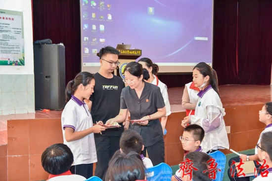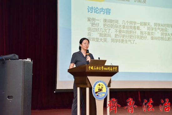 齐鲁法治(东营讯)李春军 为了进一步提高未成年人学法、懂法、守法和用法意识,提高自我保护能力,提前佩戴好暑假和新学期平安“护身符”,6月9日下午,东营市东营区法院未成年人审判社会工作站法治教育讲师团走进石大附中,为六年级全体学生现身说法,讲授预防校园欺凌课程。